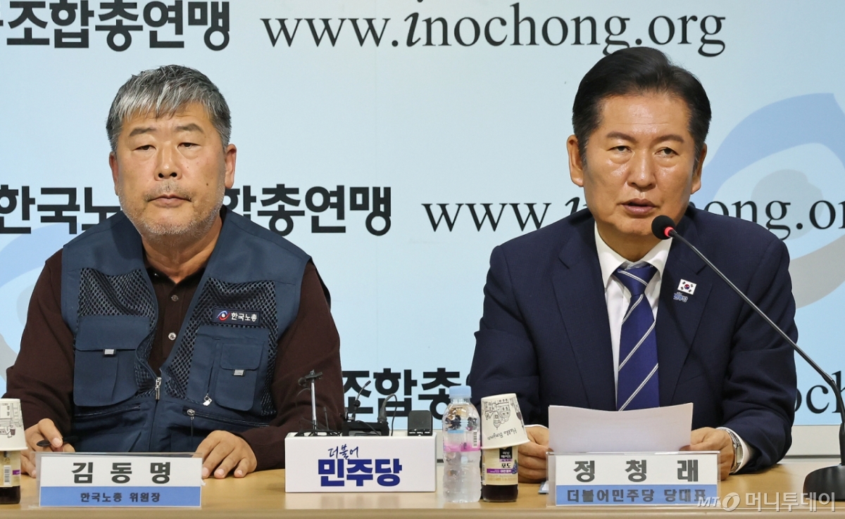 정 대표는 "민주당은 중대재해처벌법, 노란봉투법 등을 통해 노동자의 생명과 안전을 지키고 노동 3권을 강화하기 위해 많은 노력을 했고 앞으로도 그럴 것"이라며 "주 4.5일제를 단계적으로 도입해 OECD(경제협력개발기구) 평균을 한참 웃도는 과도한 노동시간을 줄여나가기 위한 노력도 한국노총과 함께 하겠다"고 말했다.