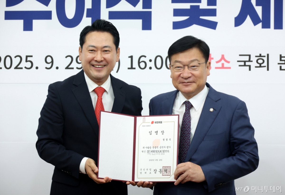 ![[서울=뉴시스] 고승민 기자 = 장동혁 국민의힘 대표가 29일 서울 여의도 국회에서 열린 선출직 공직자 평가혁신 TF 임명장 수여식 및 제1차 회의에서 정점식 TF 위원장에게 임명장을 수여하고 있다. 2025.09.29. kkssmm99@newsis.com /사진=고승민](https://thumb.mt.co.kr/cdn-cgi/image/f=avif/21/2025/09/2025092917024267999_1.jpg)