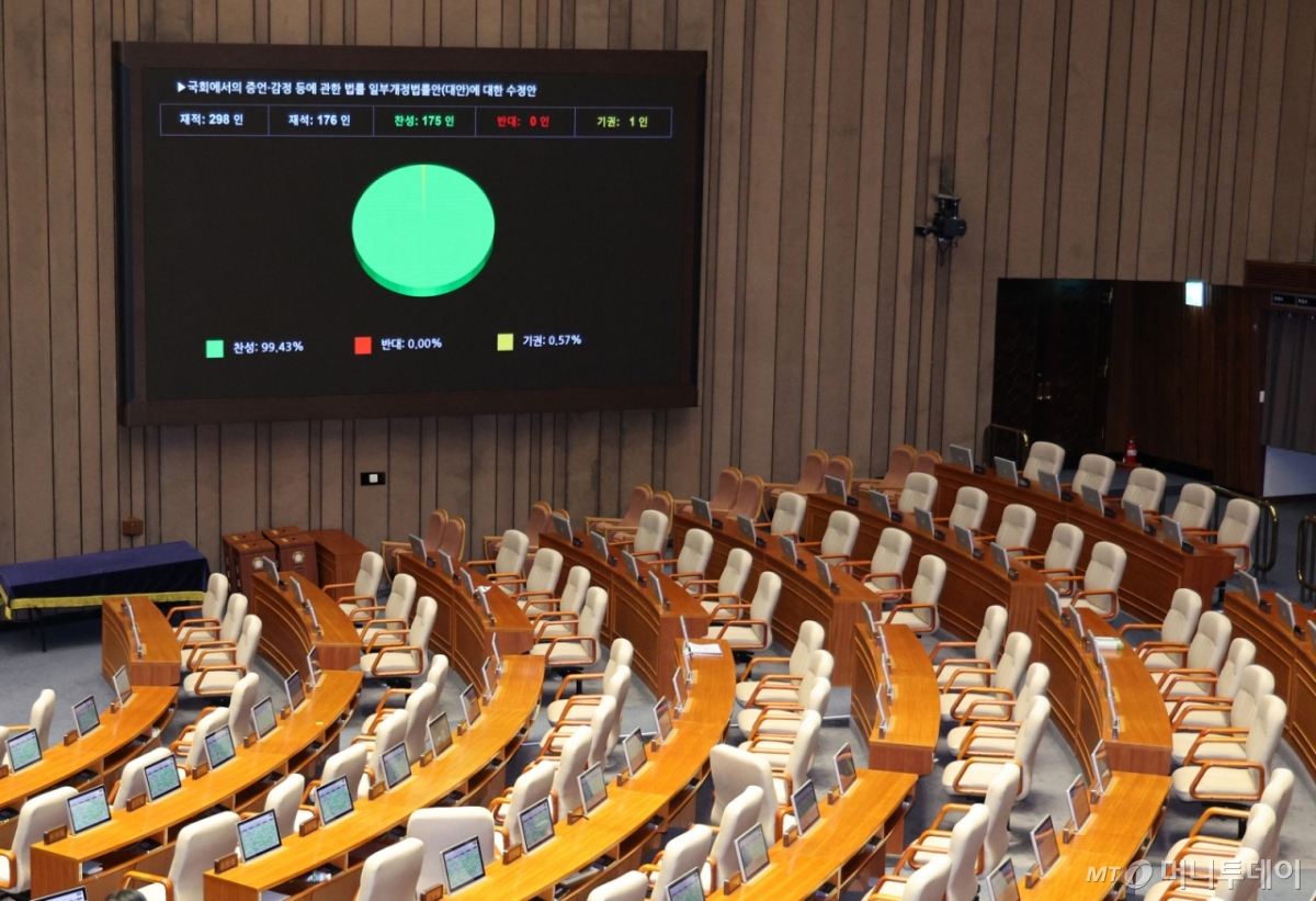 국회 특별위원회 활동 기한이 종료되더라도 증인의 위증죄에 대해 고발할 수 있도록 하는 '국회에서의 증언·감정 등에 관한 법률'(국회 증감법) 일부 개정안이 29일 더불어민주당 주도로 국회 본회의를 통과했다. 이로써 정부조직법 개정안을 시작으로 4박5일간 이어진 필리버스터 정국이 일단락됐다.