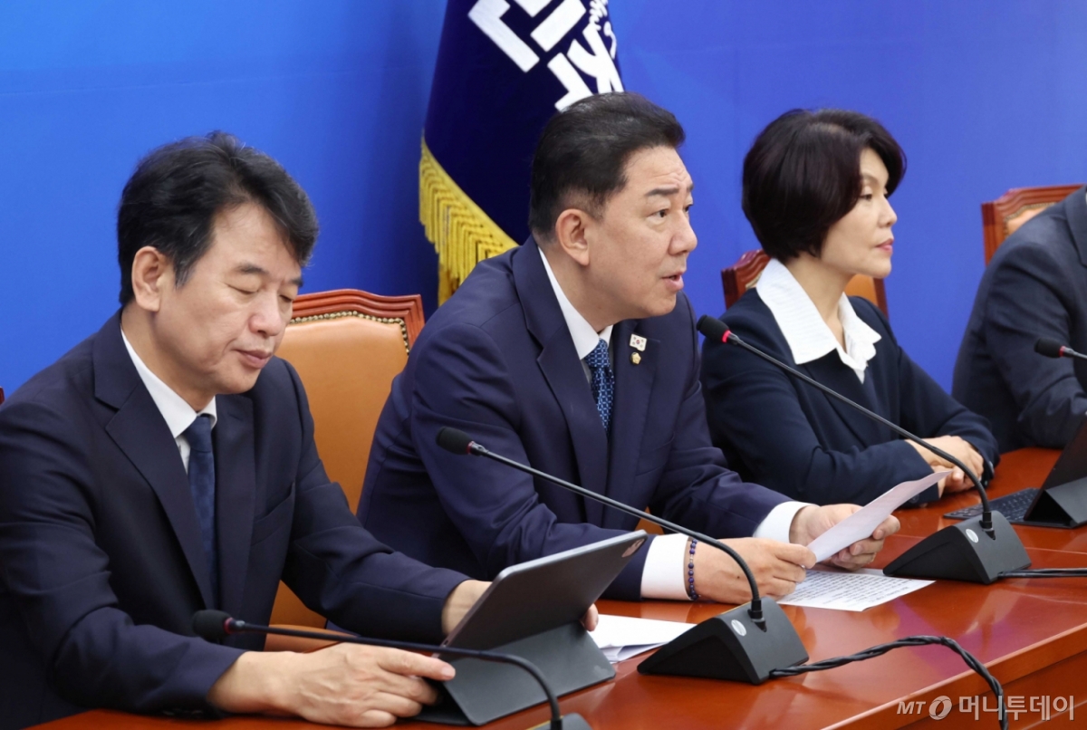 ![[서울=뉴시스] 조성봉 기자 = 김병기 더불어민주당 원내대표가 30일 오전 서울 여의도 국회에서 열린 원내대책회의에서 발언을 하고 있다. 2025.09.30. suncho21@newsis.com /사진=조성봉](https://thumb.mt.co.kr/cdn-cgi/image/f=avif/21/2025/09/2025093008283571735_1.jpg)