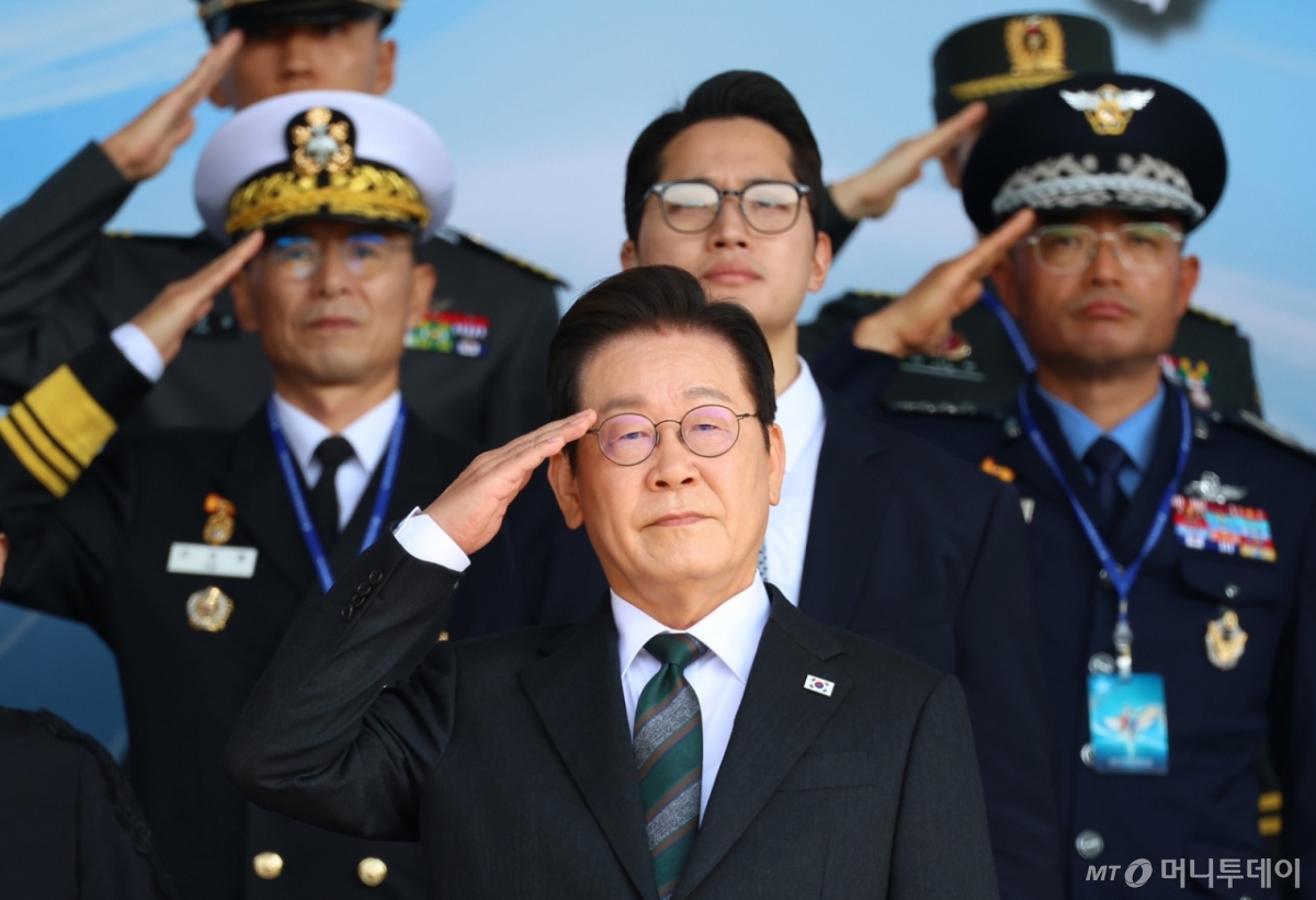 ![[계룡=뉴시스] 고범준 기자 = 이재명 대통령이 1일 충남 계룡대에서 열린 건군 77주년 국군의 날 기념식에서 거수경례하고 있다. 2025.10.01. bjko@newsis.com /사진=](https://thumb.mt.co.kr/cdn-cgi/image/f=avif/21/2025/10/2025100109492198986_1.jpg)