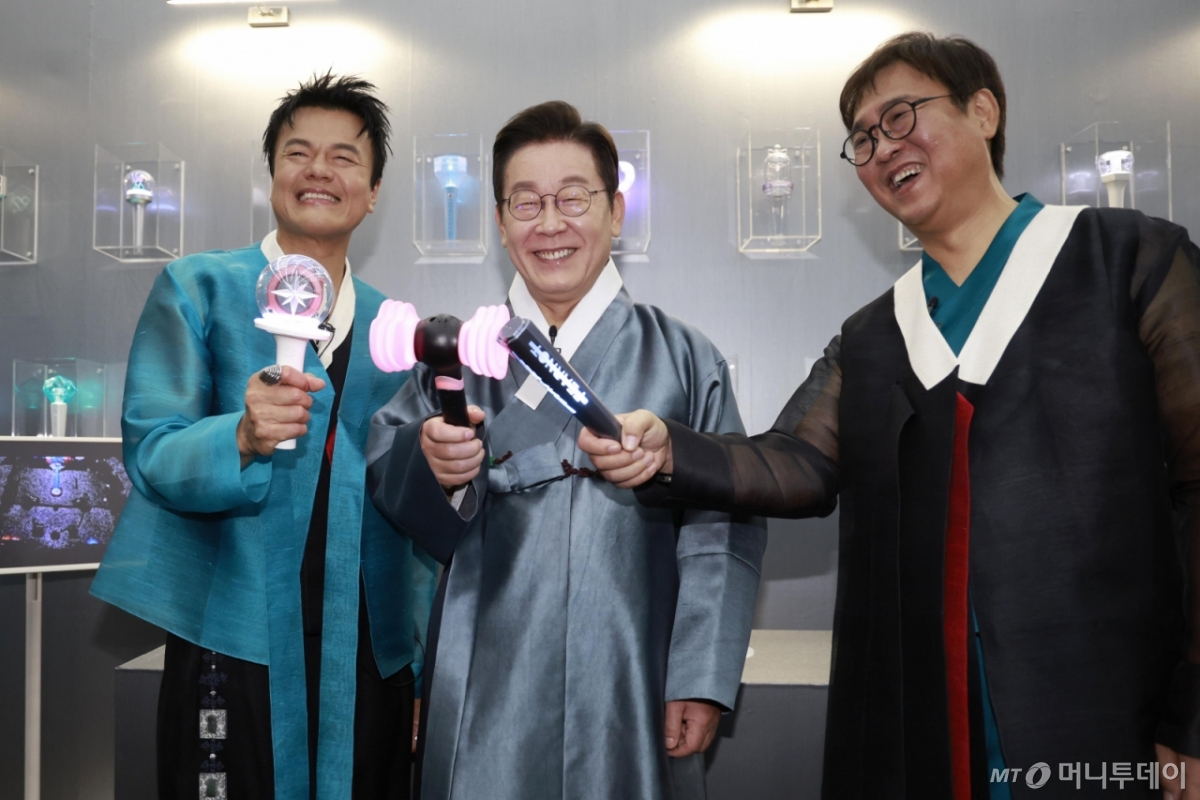 ![[고양=뉴시스] 최동준 기자 = 이재명 대통령이 1일 경기 고양시 킨텍스에서 열린 대중문화교류위원회 출범식 K컬처 체험존에서 블랙핑크 응원봉 점등을 하고 있다. 왼쪽부터 박진영 대중문화교류위원회 공동위원장, 이 대통령, 최휘영 문화체육관광부 장관. 2025.10.01. photocdj@newsis.com /사진=최동준](https://thumb.mt.co.kr/cdn-cgi/image/f=avif/21/2025/10/2025100116494979889_1.jpg)
