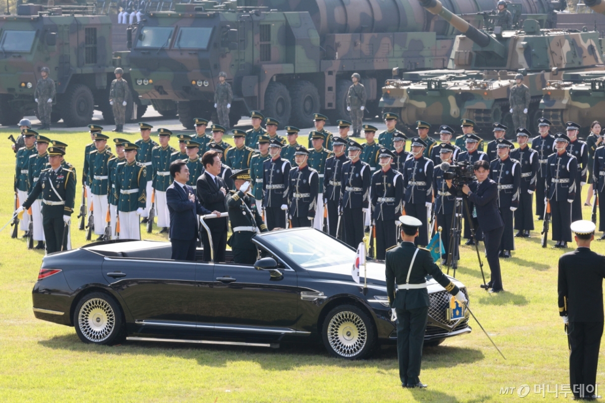 ![[계룡=뉴시스] 고범준 기자 = 이재명 대통령이 1일 충남 계룡대에서 열린 건군 77주년 국군의 날 기념식에서 열병하고 있다. 2025.10.01. bjko@newsis.com /사진=고범준](https://thumb.mt.co.kr/cdn-cgi/image/f=avif/21/2025/10/2025100117573620271_1.jpg)