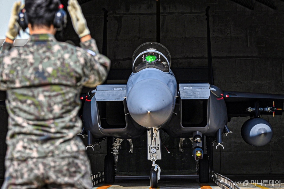 ![[서울=뉴시스] 공군은 25일 2024 호국훈련 일환으로 적 대규모 공중항체 침투대응 합동종합훈련을 실시했다. 사진은 제11전투비행단에서 훈련을 위해 이글루에서 나오고 있는 F-15K 전투기의 모습. (사진=공군 제공) 2024.10.25. photo@newsis.com *재판매 및 DB 금지](https://thumb.mt.co.kr/cdn-cgi/image/f=avif/21/2025/10/2025100209193226166_1.jpg)
