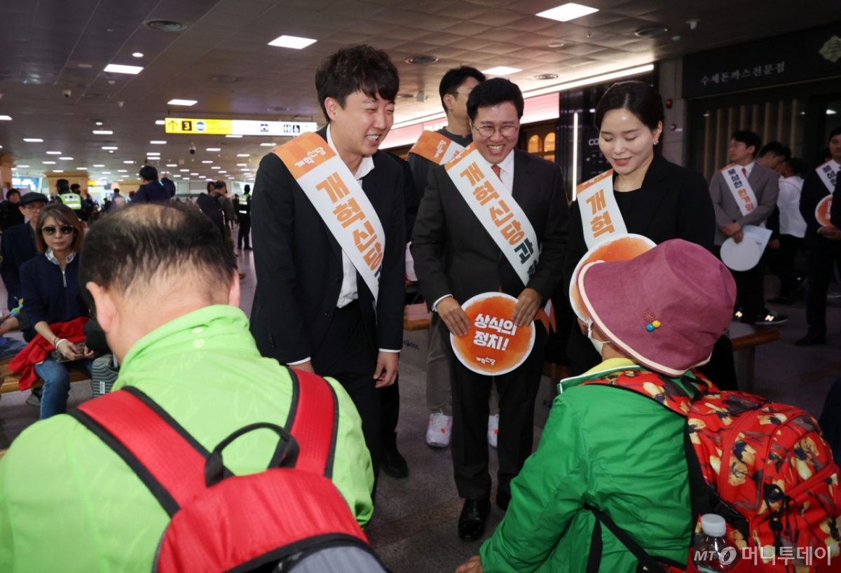 ![[서울=뉴시스] 김명년 기자 = 이준석 개혁신당 대표가 2일 오전 서울 용산구 서울역에서 추석 귀성인사를 하고 있다. 2025.10.02. kmn@newsis.com /사진=김명년](https://thumb.mt.co.kr/cdn-cgi/image/f=avif/21/2025/10/2025100910005167006_1.jpg)