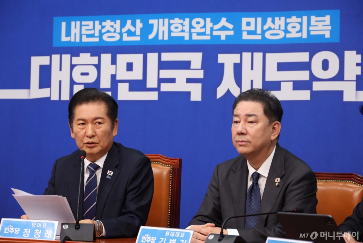 ![[서울=뉴시스] 조성봉 기자 = 정청래 더불어민주당 대표가 10일 오전 서울 여의도 국회에서 열린 최고위원회의에서 발언을 하고 있다. 오른쪽은 김병기 원내대표. 2025.10.10. suncho21@newsis.com /사진=조성봉](https://thumb.mt.co.kr/cdn-cgi/image/f=avif/21/2025/10/2025101010495192699_1.jpg)