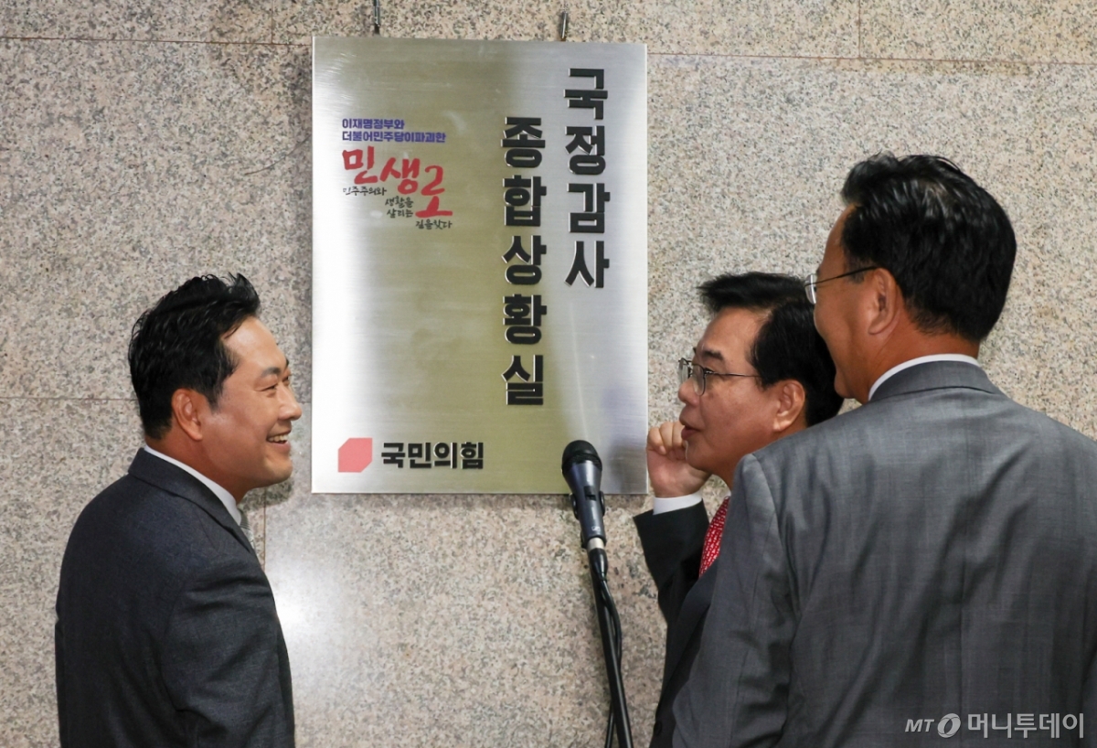 ![[서울=뉴시스] 김명년 기자 = 장동혁 국민의힘 대표와 송언석 원내대표가 10일 오전 서울 여의도 국회 원내대표실 앞에서 국정감사 종합상황실 현판식을 마치고 대화하고 있다. 2025.10.10. kmn@newsis.com /사진=김명년](https://thumb.mt.co.kr/cdn-cgi/image/f=avif/21/2025/10/2025101211094871530_1.jpg)