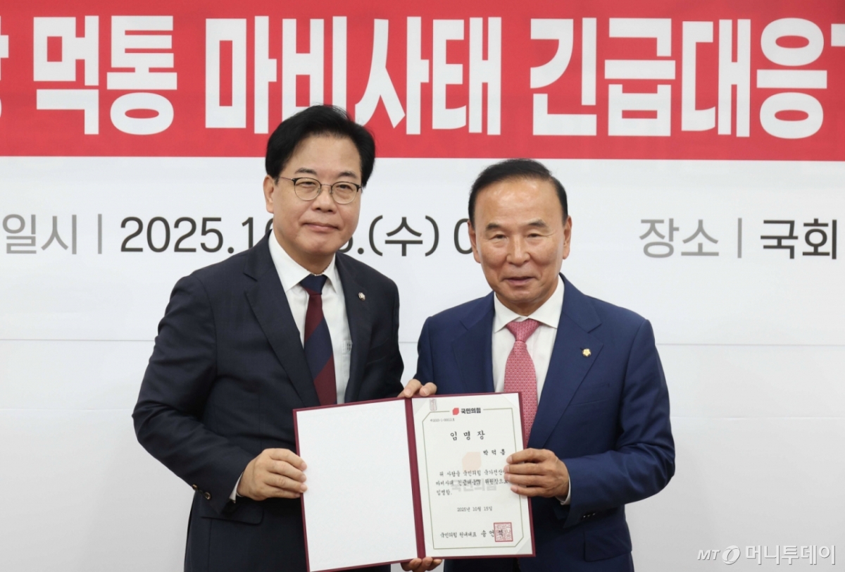 ![[서울=뉴시스] 조성봉 기자 = 송언석 국민의힘 원내대표가 15일 오전 서울 여의도 국회에서 열린 국가전산망 먹통 마비 사태 긴급 대응 TF 임명장 수여식에서 박덕흠 TF 위원장과 기념촬영을 하고 있다.2025.10.15. suncho21@newsis.com /사진=조성봉](https://thumb.mt.co.kr/cdn-cgi/image/f=avif/21/2025/10/2025101509524997081_1.jpg)
