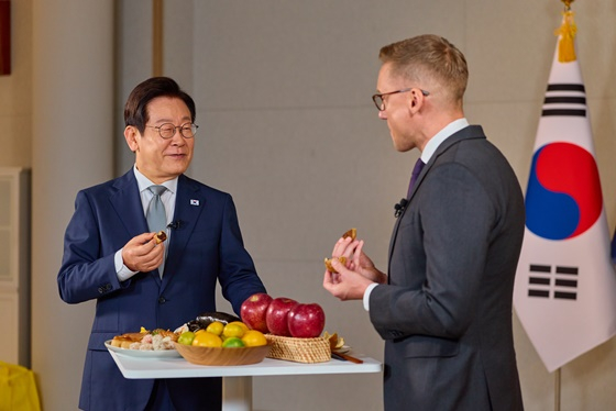 이 대통령은 이날 CNN과의 인터뷰 장소에서 안동 사과와 귤, 김밥 등을 차려놓고 인터뷰 진행자와 함께 맛보며 "K-푸드는 아마 전 세계적으로 본다면 건강식으로 최고일 것 같다"고 말했다.
