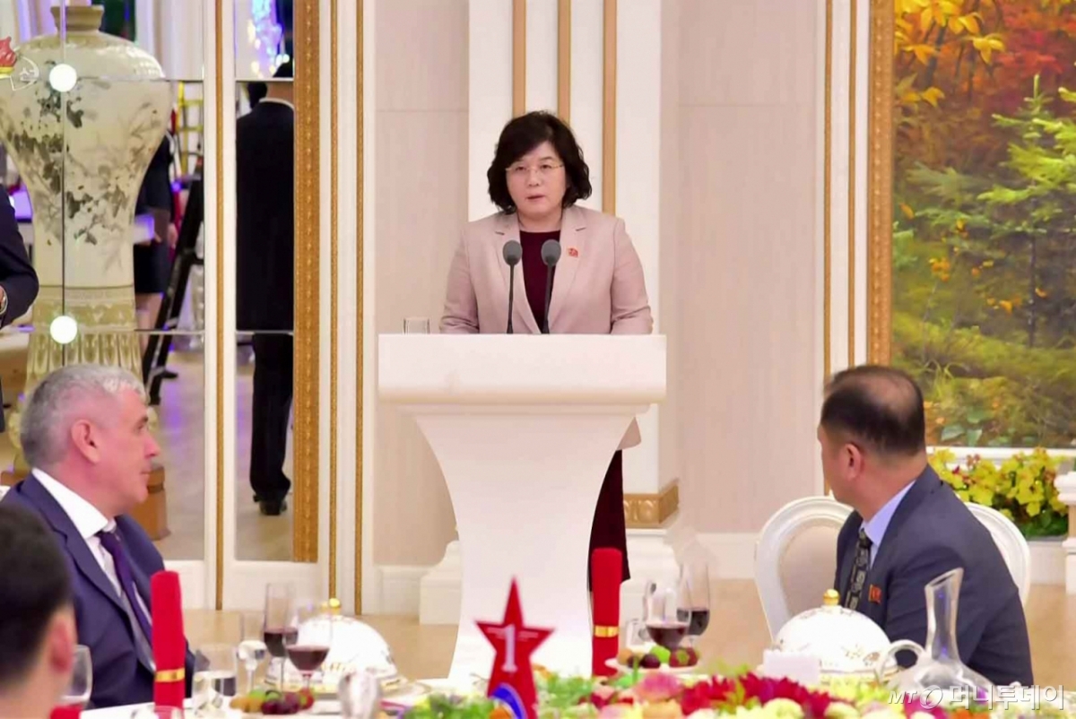 ![[서울=뉴시스] = 최선희 북한 외무상이 지난 19일 북한 러시아 평양수뇌상봉과 포괄적 전략적 동반자관계에 관한 조약체결 1주년에 즈음해 외무성과 북한주재 러시아대사관이 공동으로 개최한 연회에서 발언하고 있다. (사진=조선중앙TV 캡처) 2025.06.20. photo@newsis.com *재판매 및 DB 금지](https://thumb.mt.co.kr/cdn-cgi/image/f=avif/21/2025/10/2025102610462835797_1.jpg)