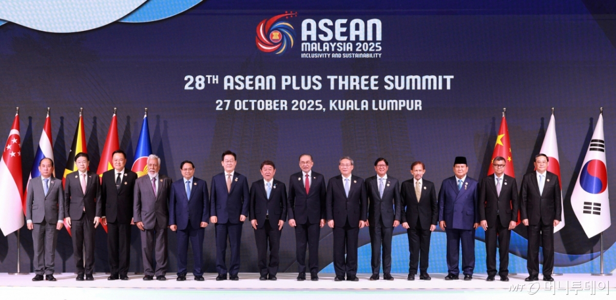 ![[쿠알라룸푸르=뉴시스] 고범준 기자 = 이재명(왼쪽 여섯번째) 대통령이 27일(현지 시간) 말레이시아 쿠알라룸푸르 컨벤션 센터에서 열린 아세안+3(한중일) 정상회의에서 각국 참석자들과 기념촬영을 하고 있다. 왼쪽부터 하우 칸 솜 미얀마 외교부 사무차관, 로런스 웡 싱가포르 총리, 아누틴 찬위라꾼 태국 총리, 사나나 구스마오 동티모르 총리, 팜 민 찐 베트남 총리, 이 대통령, 모테기 도시미쓰 일본 외무대신, 안와르 이브라힘 말레이시아 총리, 리창 중국 총리, 페르디난드 마르코스 필리핀 대통령, 하사날 볼키아 브루나이 국왕, 프라보워 수비안토 인도네시아 대통령, 헝쭈은 나론 캄보디아 교육부 장관, 손싸이 시판돈 라오스 총리. 2025.10.27. bjko@newsis.com /사진=고범준](https://thumb.mt.co.kr/cdn-cgi/image/f=avif/21/2025/10/2025102716234389062_1.jpg)