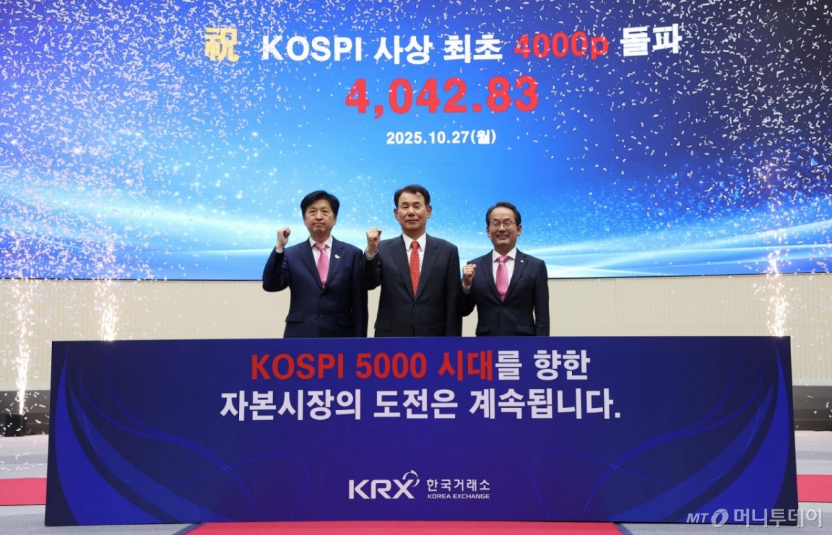 ![[서울=뉴시스] 권창회 기자 = 정은보 한국거래소 이사장과 오기형, 강준현 더불어민주당 의원이 27일 오후 서울 여의도 한국거래소에서 열린 코스피 4000p 돌파 기념행사에서 기념촬영을 하고 있다. 이날 코스피 지수는 전 거래일 보다 2.57%(101.24포인트) 오른 4042.83포인트에 거래를 마쳤다. (공동취재) 2025.10.27. photo@newsis.com /사진=](https://thumb.mt.co.kr/cdn-cgi/image/f=avif/21/2025/10/2025102717223539973_1.jpg)