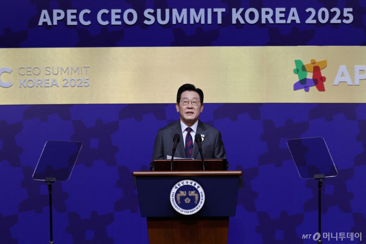 [the300] (로이터=뉴스1) = 이재명 대통령이 29일 경상북도 경주 예술의전당에서 열린 아시아태평양경제협력체(APEC) CEO 서밋 개막식에서 특별연설을 하고 있다. ⓒ 로이터=뉴스1 Copyright © 뉴스1. All rights reserved. 무단 전재 및 재배포, AI학습 이용 금지. /사진=(로이터=뉴스1) 이재명 대통령, 29일 경주 예술의전당 '2025 APEC(아시아태평양경제협력체) CEO(최고경영자) 서밋' 독자들의 PICK! 허니문 베이비 '출생의 비밀'...결혼 직전 전남친 만난 아내 소유, 임영웅과 '제주도 열애설' 전말 공개 '음주 뺑소니' 김호중, 옥중 50억 돈방석?…지분가치 '반전' 남편 방에 정력제..."아들아, 인생 즐겨" 불륜 응원한 시모