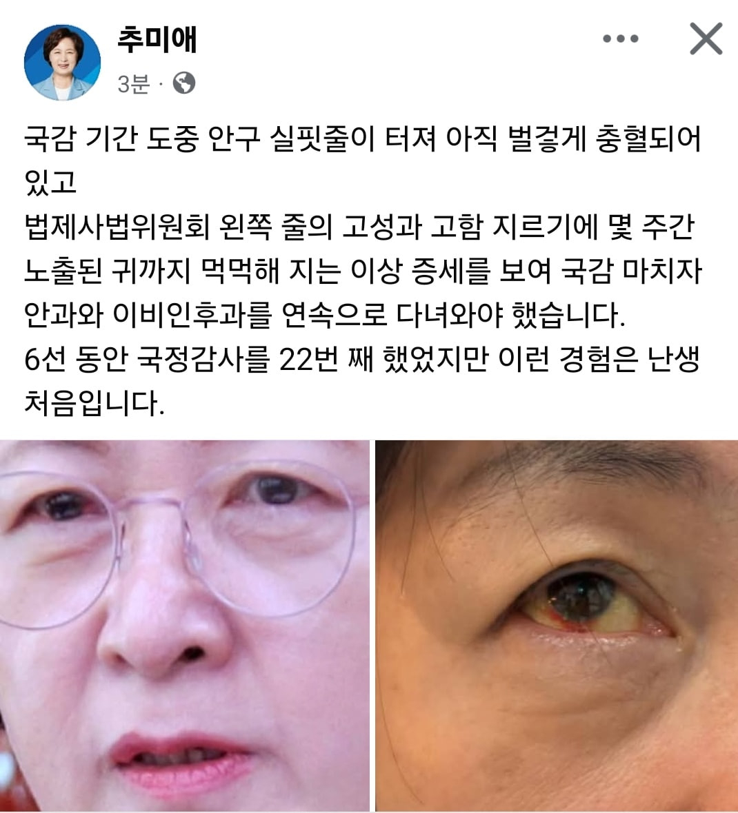 국회 법제사법위원장을 맡은 추미애 더불어민주당 의원이 "국감 기감 도중 안구 실핏줄이 터져 아직도 벌겋게 충혈됐다"고 밝혔다.