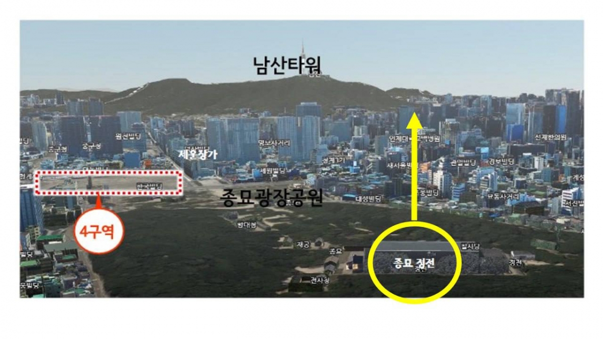 배현진 의원실은 종묘 정전에서 남산 방향을 보는 조감도를 공개하며 '세운상가에 들어설 고층 건물이 종묘에서 남산을 가린다'는 주장을 반박했다.