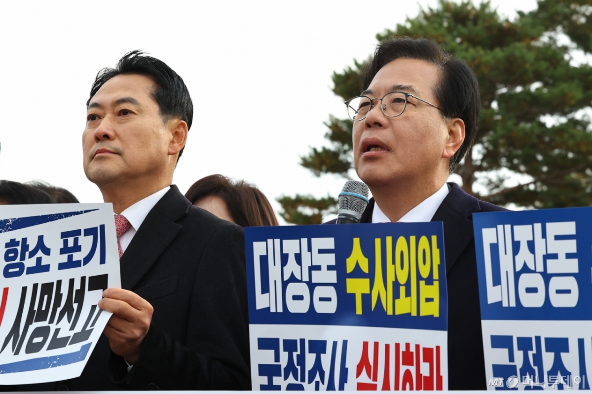 송 원내대표는 "대장동 사건은 항소 준비가 이미 끝나 있는 상태였다. 서울중앙지검장의 결재까지 완료됐다"며 "그런데 느닷없이 법무부 의견을 받아 항소 포기 결정을 했다. 누가 이 결정을 내렸나. 바로 이재명정권"이라고 했다.