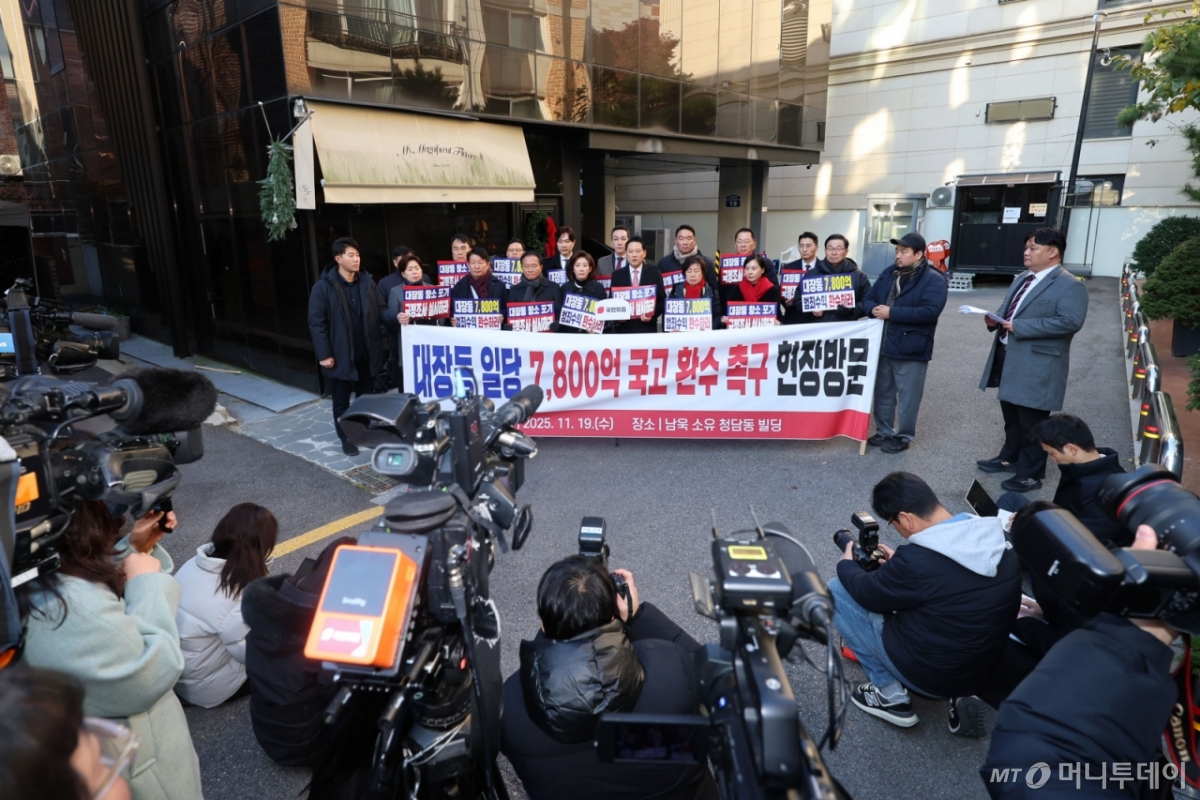 ![[서울=뉴시스] 권창회 기자 = 장동혁 국민의힘 대표가 19일 오전 서울 강남구 청담동 남욱 소유 빌딩을 방문해 대장동 일당의 7,800억원 국고 환수를 촉구하고 있다. 2025.11.19. kch0523@newsis.com /사진=](https://thumb.mt.co.kr/cdn-cgi/image/f=avif/21/2025/11/2025111908233728209_1.jpg)