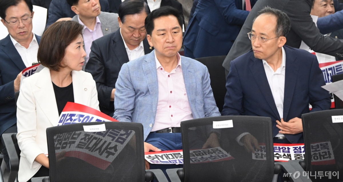 ![[서울=뉴시스] 김명년 기자 = 나경원(왼쪽부터), 김기현, 추경호 국민의힘 의원이 14일 서울 여의도 중앙당사에서 열린 긴급 의원총회에서 대화하고 있다.(공동취재) 2025.08.14. photo@newsis.com /사진=조성봉](https://thumb.mt.co.kr/cdn-cgi/image/f=avif/21/2025/11/2025111915185610493_1.jpg)