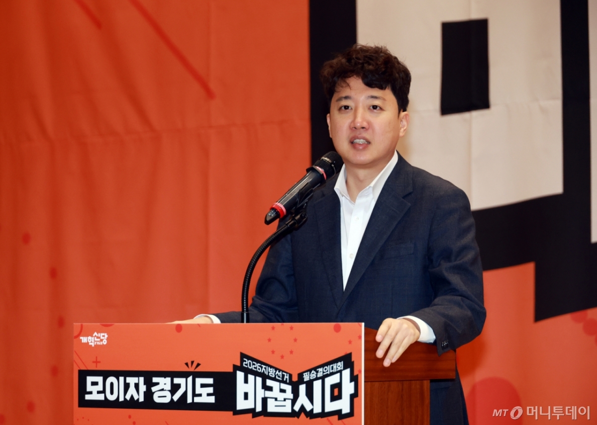 ![[서울=뉴시스] 고승민 기자 = 이준석 개혁신당 대표가 23일 서울 여의도 국회 의원회관에서 열린 '모이자 경기도! 필승결의대회'에서 축사를 하고 있다. 2025.11.23. kkssmm99@newsis.com /사진=고승민](https://thumb.mt.co.kr/cdn-cgi/image/f=avif/21/2025/11/2025112311541778576_1.jpg)