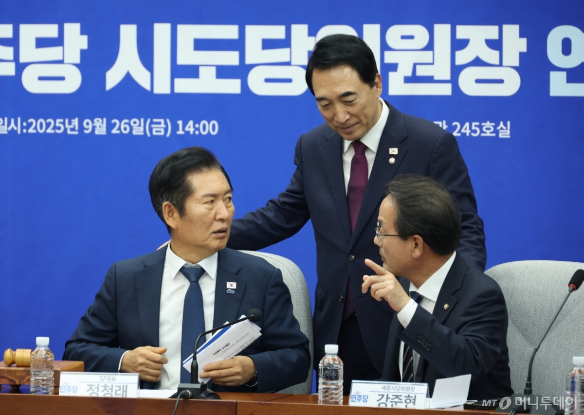 ![[서울=뉴시스] 고승민 기자 = 더불어민주당 정청래 대표, 강준현 세종시당위원장, 박수현 의원이 26일 서울 여의도 국회에서 열린 시도당위원장 연석회의에서 대화하고 있다. 2025.09.26. kkssmm99@newsis.com /사진=고승민](https://thumb.mt.co.kr/cdn-cgi/image/f=avif/21/2025/11/2025112316532611945_1.jpg)