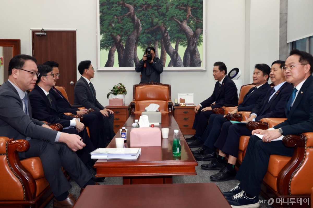 ![[서울=뉴시스] 고승민 기자 = 더불어민주당 김병기 원내대표와 문진석 원내수석부대표, 국민의힘 송언석 원내대표와 유상범 원내수석부대표 등 여야 원내대표단, 구윤철 경제부총리 겸 기획재정부 장관이 1일 서울 여의도 국회에서 회동하고 있다. 2025.12.01. kkssmm99@newsis.com /사진=고승민](https://thumb.mt.co.kr/cdn-cgi/image/f=avif/21/2025/12/2025120209002744301_1.jpg)