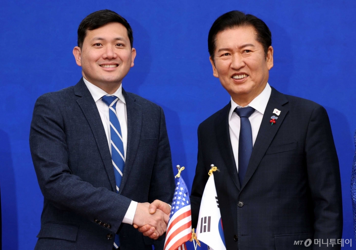 ![[서울=뉴시스] 조성봉 기자 = 정청래 더불어민주당 대표가 2일 오전 서울 여의도 국회에서 케빈 김 주한미국대사대리를 접견하며 악수를 하고 있다.2025.12.02. suncho21@newsis.com /사진=조성봉](https://thumb.mt.co.kr/cdn-cgi/image/f=avif/21/2025/12/2025120214405945942_1.jpg)