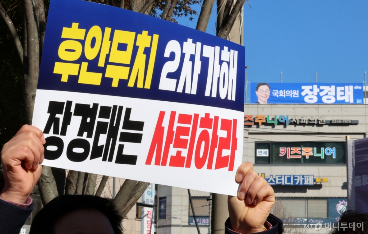 ![[서울=뉴시스] 이영환 기자 = 4일 오후 서울 동대문구 더불어민주당 장경태 의원 사무실 앞에서 국민의힘 중앙여성위원회가 주최한 권력형 성범죄 의혹 진상 규명 및 재발 방지 대책 수립 촉구 기자회견에서 한 참석자가 피켓을 들고 있다. 2025.12.04. 20hwan@newsis.com /사진=이영환](https://thumb.mt.co.kr/cdn-cgi/image/f=avif/21/2025/12/2025120413420027366_1.jpg)