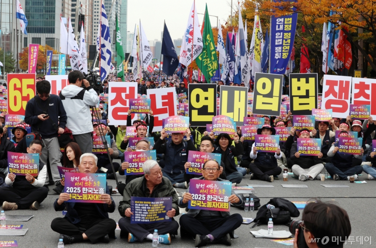 ![[서울=뉴시스] 이영환 기자 = 8일 오후 서울 영등포구 여의대로에서 열린 2025 한국노총 전국노동자대회에서 참석자들이 구호를 외치고 있다. 2025.11.08. 20hwan@newsis.com /사진=이영환](https://thumb.mt.co.kr/cdn-cgi/image/f=avif/21/2025/12/2025120416033298998_1.jpg)