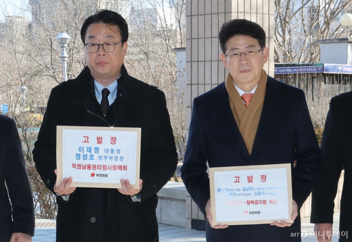 국민의힘 법률자문위원회는 이날 경기 과천시 공수처 민원실에 방문해 직권남용권리행사방해 혐의로 이 대통령과 정 장관에 대한 고발장을 제출했다.
