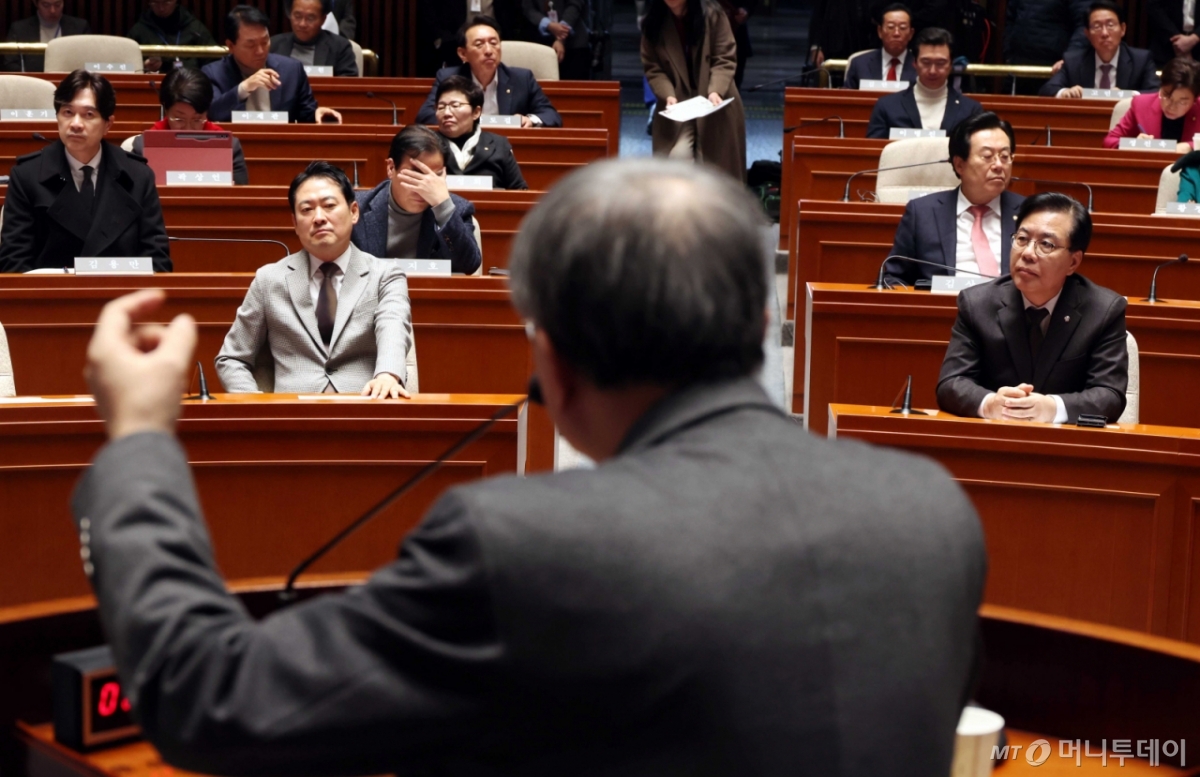 ![[서울=뉴시스] 조성봉 기자 = 장동혁 국민의힘 대표와 송언석 원내대표를 비롯한 의원들이 8일 오후 서울 여의도 국회에서 열린 의원총회 및 이재명 정권 독재악법 국민고발회에서 장영수 고려대 법학전문대학원 교수의 '내란전담재판부 설치 법안' 관련 발표를 경청하고 있다. 2025.12.08. suncho21@newsis.com /사진=조성봉](https://thumb.mt.co.kr/cdn-cgi/image/f=avif/21/2025/12/2025120817252978761_1.jpg)