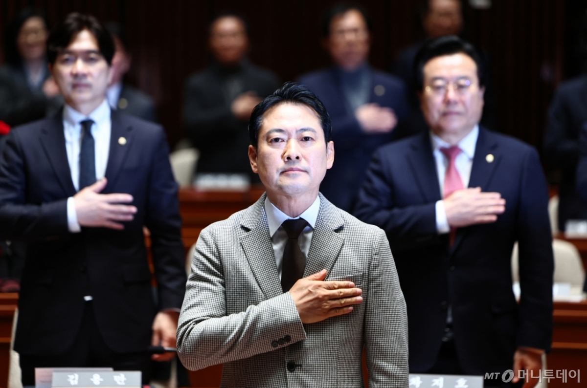 ![[서울=뉴시스] 김명년 기자 = 장동혁 국민의힘 대표가 8일 오전 서울 여의도 국회에서 열린 의원총회 및 이재명 정권 독재악법 국민고발회에서 국민의례하고 있다. 2025.12.08. kmn@newsis.com /사진=김명년](https://thumb.mt.co.kr/cdn-cgi/image/f=avif/21/2025/12/2025120915393490227_1.jpg)