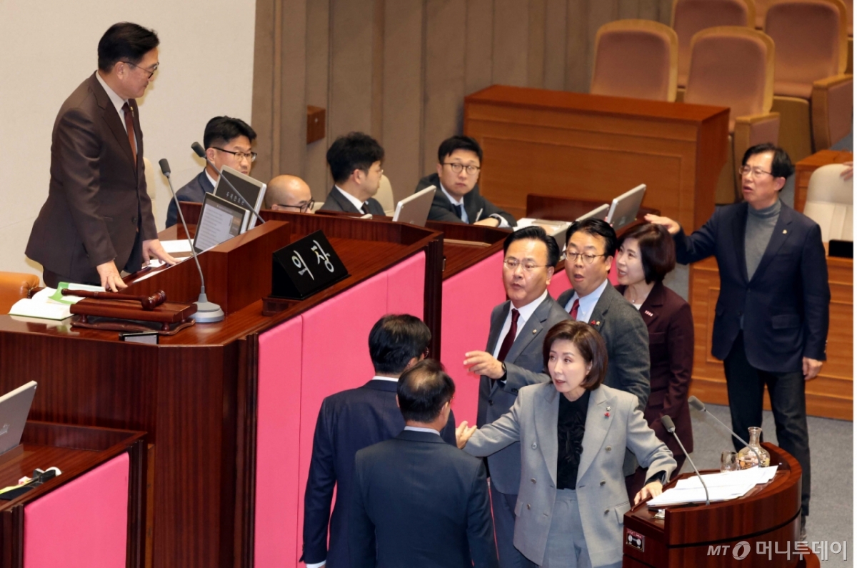 이에 나 의원과 국민의힘 의원들이 거세게 반발했다. 우 의장은 "나 의원이 단상에 오를 때 국회의장에게 인사하지 않는 등 회의 진행에 협조하지 않고 있다"고 지적했다.
