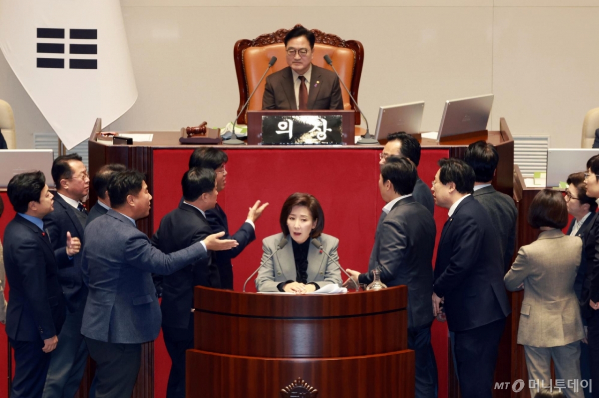 ![[서울=뉴시스] 고승민 기자 = 나경원 국민의힘 의원이 9일 서울 여의도 국회에서 열린 제429회국회(정기회) 제16차 본회의에서 가맹사업거래의 공정화에 관한 법률 일부개정법률안에 대한 필리버스터를 하던 중 의제와는 관련없는 발언을 이어가자 여야 의원들이 나와 언쟁을 벌이고 있다. 2025.12.09. kkssmm99@newsis.com /사진=고승민](https://thumb.mt.co.kr/cdn-cgi/image/f=avif/21/2025/12/2025121000114145952_1.jpg)