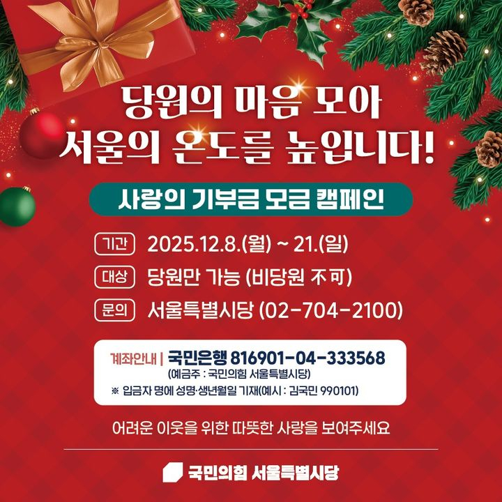 국민의힘 서울특별시당이 연말연시 소외된 이웃, 취약계층을 돕기 위한 당원 모금 행사를 실시한다.