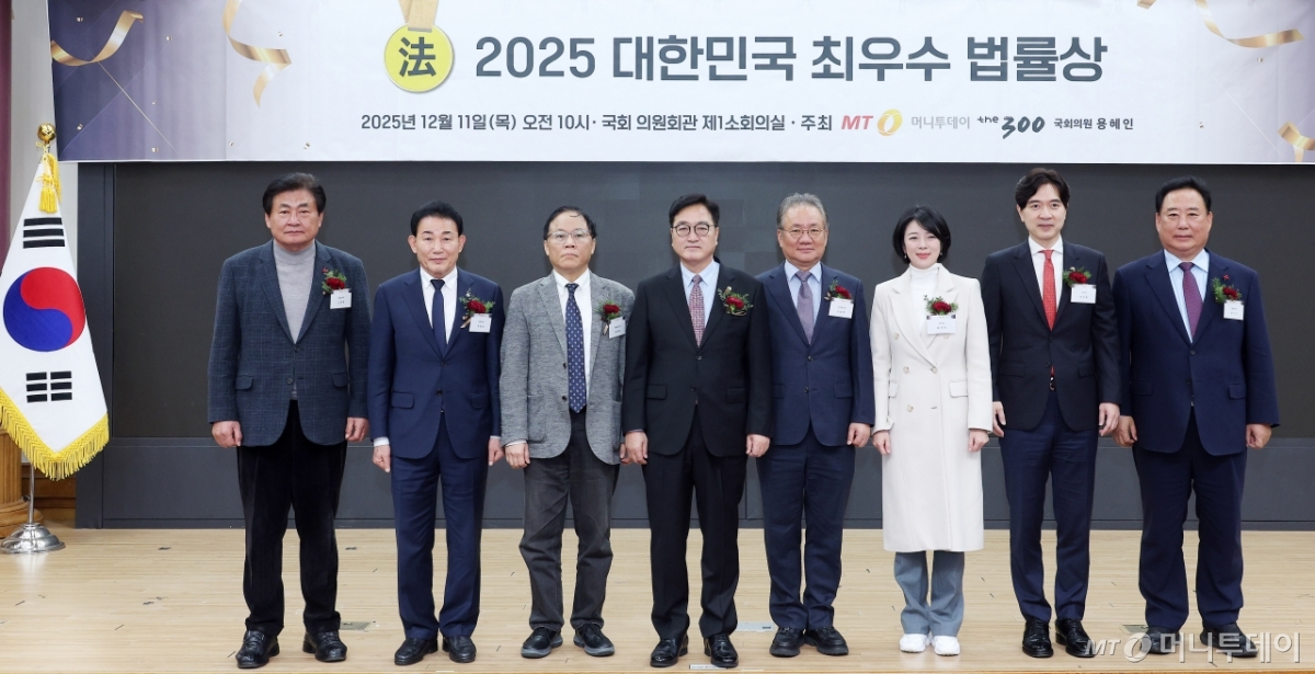 강호병 머니투데이 대표, 우원식 국회의장을 비롯한 수상 의원들이 11일 서울 여의도 국회 의원회관에서 열린 '2025 대한민국 최우수 법률상'에서 기념촬영을 하고 있다. 사진 왼쪽부터 소병훈 더불어민주당 의원, 박용갑 더불어민주당 의원, 채원호 가톨릭대학교 교수, 우원식 국회의장, 강호병 머니투데이 대표, 배현진 국민의힘 의원, 박성훈 국민의힘 의원, 어기구 더불어민주당 의원. 독자들의 PICK! '성매매 논란' 지나, 결혼·출산?…웨딩드레스 이어 유모차까지 100만원도 못 벌던 개그맨..."수입 1000배" 변호사 된 깜짝 근황 엄마 출근하면 돌변한 아빠...'미성년' 의붓딸 성폭행, 2살 친딸도 폭행 "제수씨와 잠자리를?" 초강수 질문…'친자확인' 남편, 끝내 결백 입증