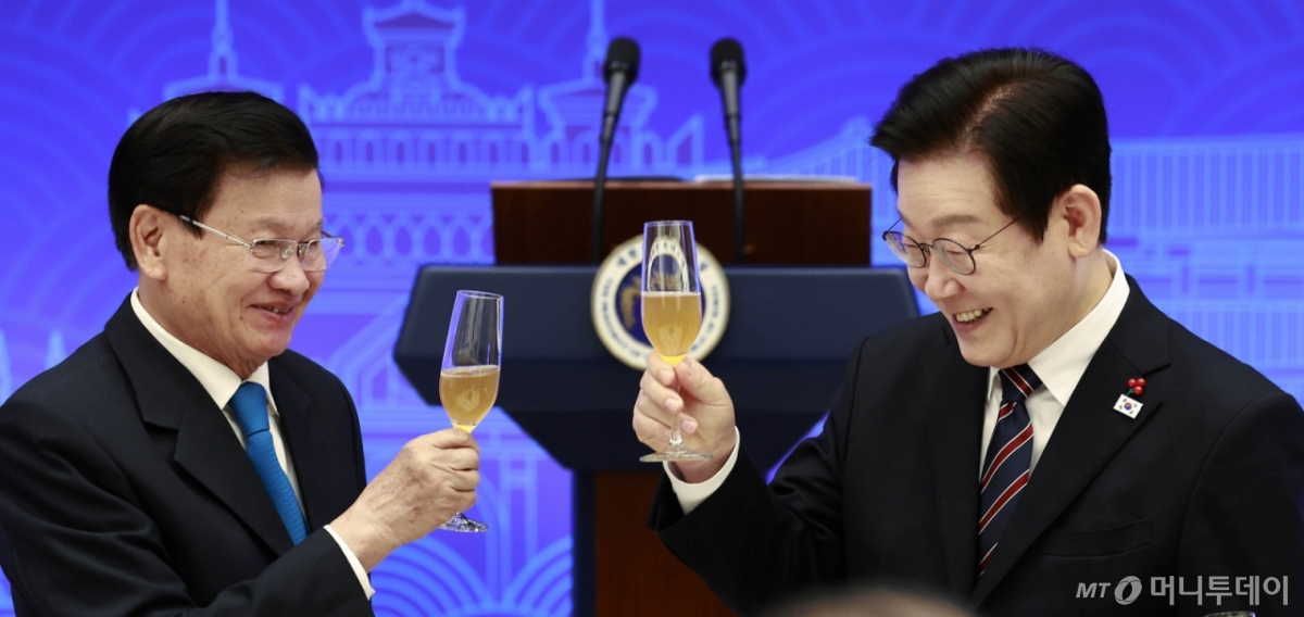 [서울=뉴시스] 최동준 기자 = 이재명 대통령과 통룬 시술릿 라오스 국가주석이 15일 서울 용산 대통령실에서 열린 한-라오스 공식오찬에서 건배하고 있다. 2025.12.15. [email protected] /사진=최동준