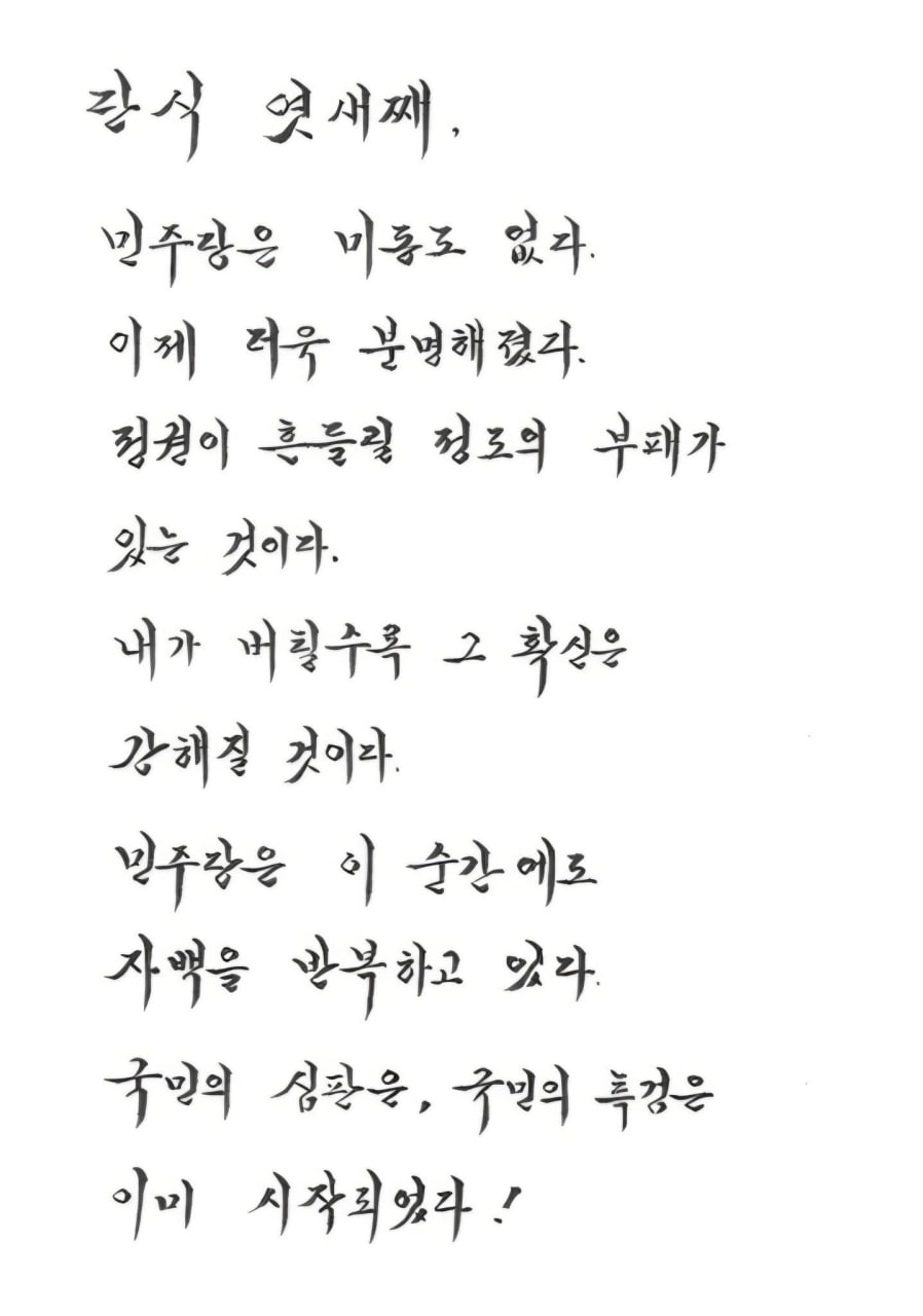 이어 "내가 버틸수록 그 확신은 강해질 것"이라며 "민주당은 이 순간에도 자백을 반복하고 있다. 국민의 심판과 특검은 이미 시작됐다"고 했다.