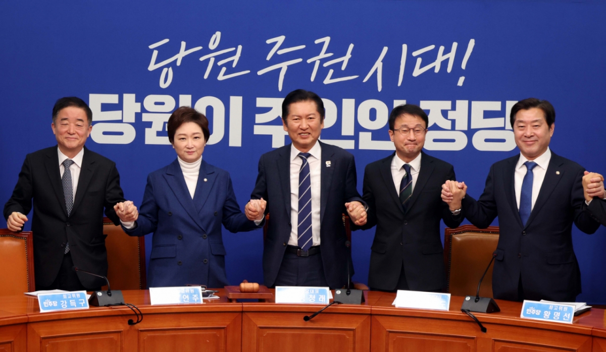 민주당 지도부는 11일 열린 최고위원회의에서 손을 맞잡고 "잘하겠습니다"라고 인사했다. 정 대표는 "우리 안의 작은 차이를 넘어 오직 지방선거 승리를 위해 큰 같음을 바탕으로 총단결하겠다"고 했다. 통합에 반대했던 최고위원들은 "고뇌 끝에 결단을 내려준 정 대표에게 감사드린다"고 했다.