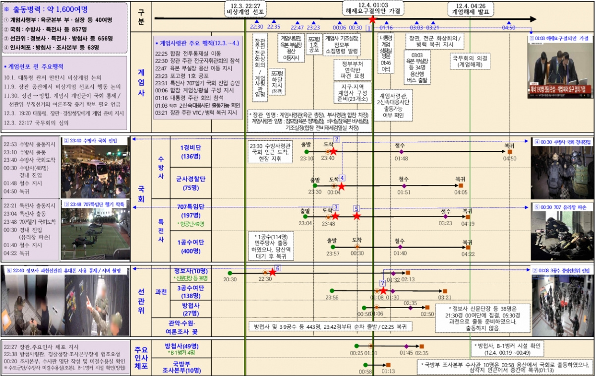 국방부에 따르면, 12·3 계엄에 동원된 주요 부대와 병력수는 합동참모본부, 육군본부, 방첩사, 특수전사령부, 수방사령부, 정보사 등 1600여명 수준으로 추정된다. 이들은 계엄의 컨트롤타워인 계엄사령부를 구성하고 국회와 선거관리위원회 3곳, 여론조사 꽃, 민주당사 등으로 출동한 것으로 확인됐다. 비상계엄 사건의 전개는 크게 △계엄상황실 구성 △국회 병력 투입 △선관위 병력 투입 △주요 인사 체포조 구성 등의 양상으로 나타났다.