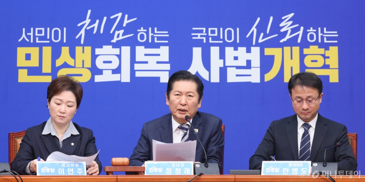 정 대표는 "관세 재인상의 파고를 넘기 위해 특별법 처리가 시급하다"며 "입법 지연을 이유로 관세가 25%로 회귀한다면 이로 인해 발생할 경제적 피해와 신뢰 훼손의 책임을 국민의힘이 다 짊어질 건가"라고 했다.