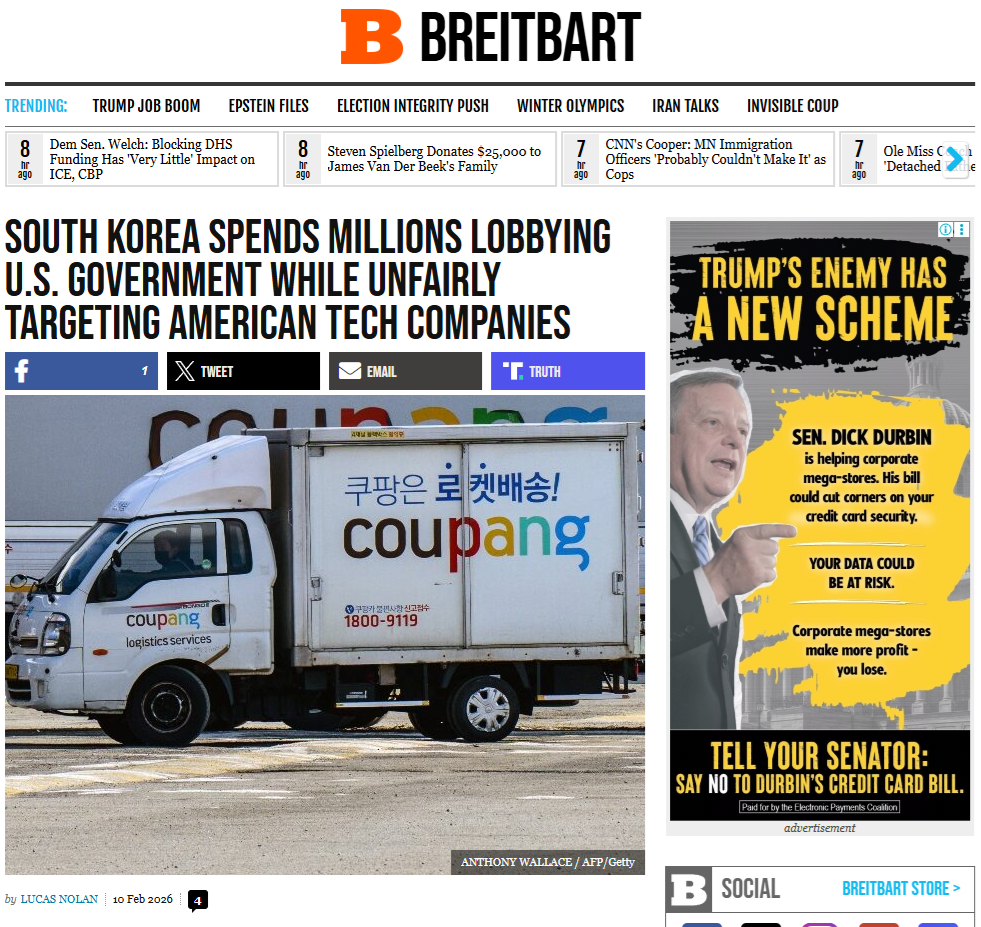 앞서 미국 매체 브라이트바트는 지난 10일 '한국은 미국 기술 기업들을 부당하게 표적으로 삼으면서, 미국 정부 로비에 수백만 달러를 지출하고 있다'는 제목의 기사에서 한국 정부가 쿠팡을 비롯한 미국 기업을 규제하기 위해 전직 미 의회 의원과 백악관 관계자 등 고위급 인사에 3700만달러 규모의 로비자금을 투입했다고 보도했다.