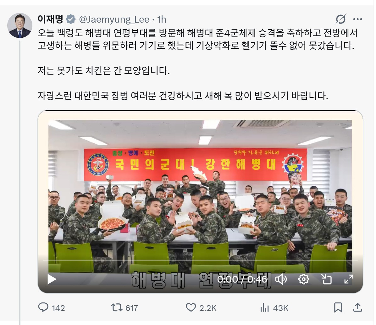 이재명 대통령이 설 연휴 전날 깜짝 선물로 치킨을 해병대 연평부대에 보냈다.
