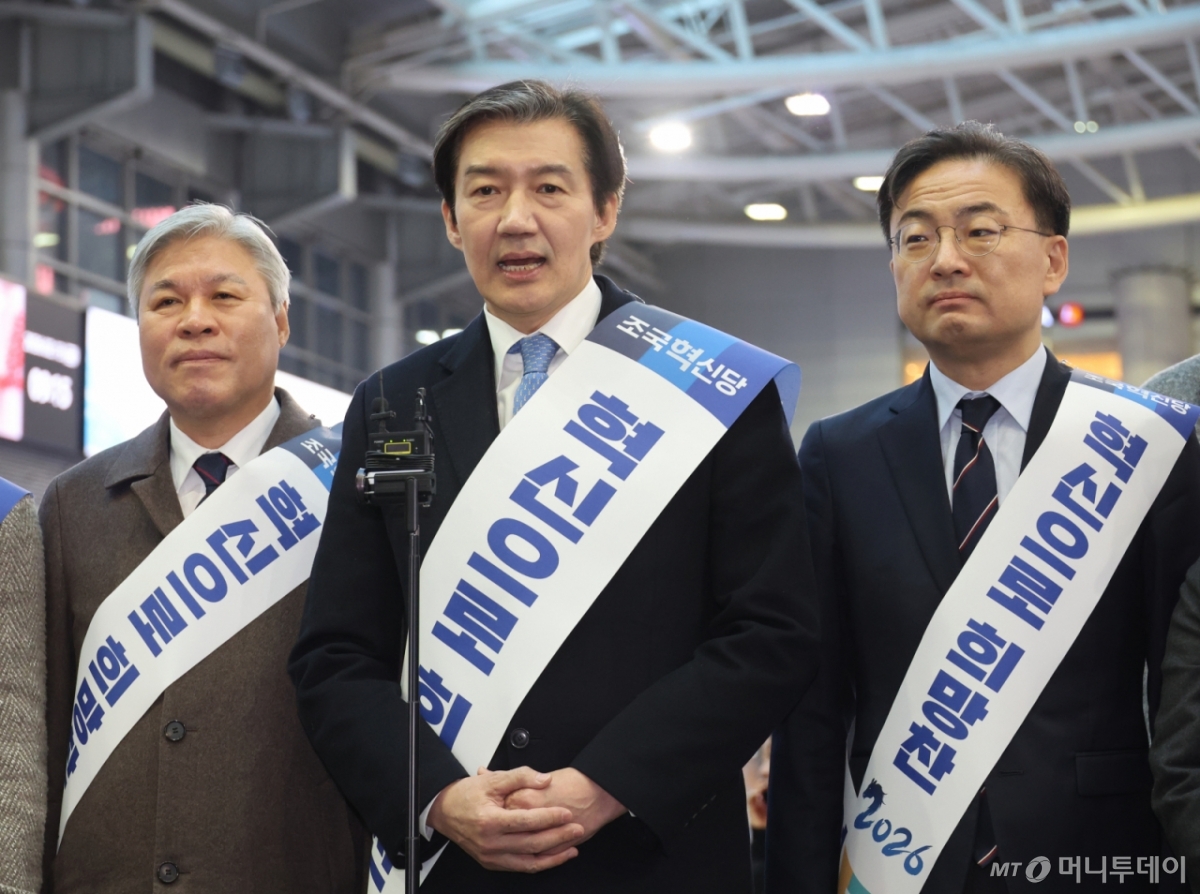 ![[서울=뉴시스] 김금보 기자 = 조국 조국혁신당 대표가 13일 오전 서울 용산구 용산역에서 설 명절 귀성객에게 전하는 인사말을 하고 있다. 2026.02.13. kgb@newsis.com /사진=김금보](https://thumb.mt.co.kr/cdn-cgi/image/f=avif/21/2026/02/2026021409325930550_1.jpg)