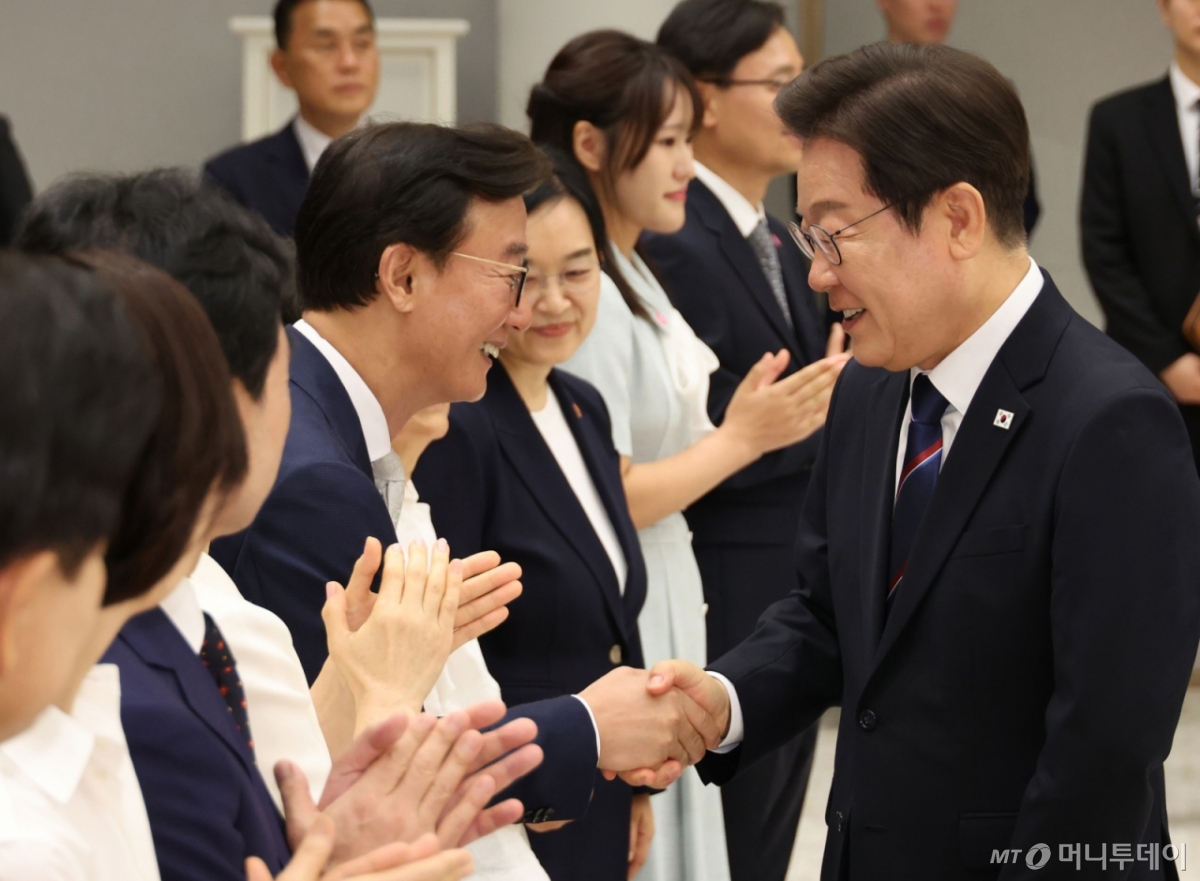 ![[서울=뉴시스] 최동준 기자 = 이재명 대통령이 28일 서울 용산 대통령실 청사에서 열린 신임 국무위원 및 국세청장 임명장 수여식에서 전재수 해양수산부 장관과 악수하고 있다. (대통령실통신사진기자단) 2025.07.28. photocdj@newsis.com /사진=](https://thumb.mt.co.kr/cdn-cgi/image/f=avif/21/2026/02/2026021913561055939_1.jpg)