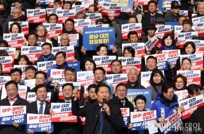 이들이 이날 국회를 찾은 건 충남·대전 행정통합에 반대하는 국민의힘을 규탄하기 위해서다. 광주·전남, 대구·경북 통합은 24일 본회의를 앞두고 순항 중이지만 충남·대전 통합은 난항을 겪고 있어서다. 이장우 대전시장과 김태흠 충남지사 등 국민의힘 소속 광역 자치단체장들은 재정 분권을 비롯한 실질적인 중앙정부 권한 이양이 부족하다며 행정통합법 처리에 반대하고 있다.