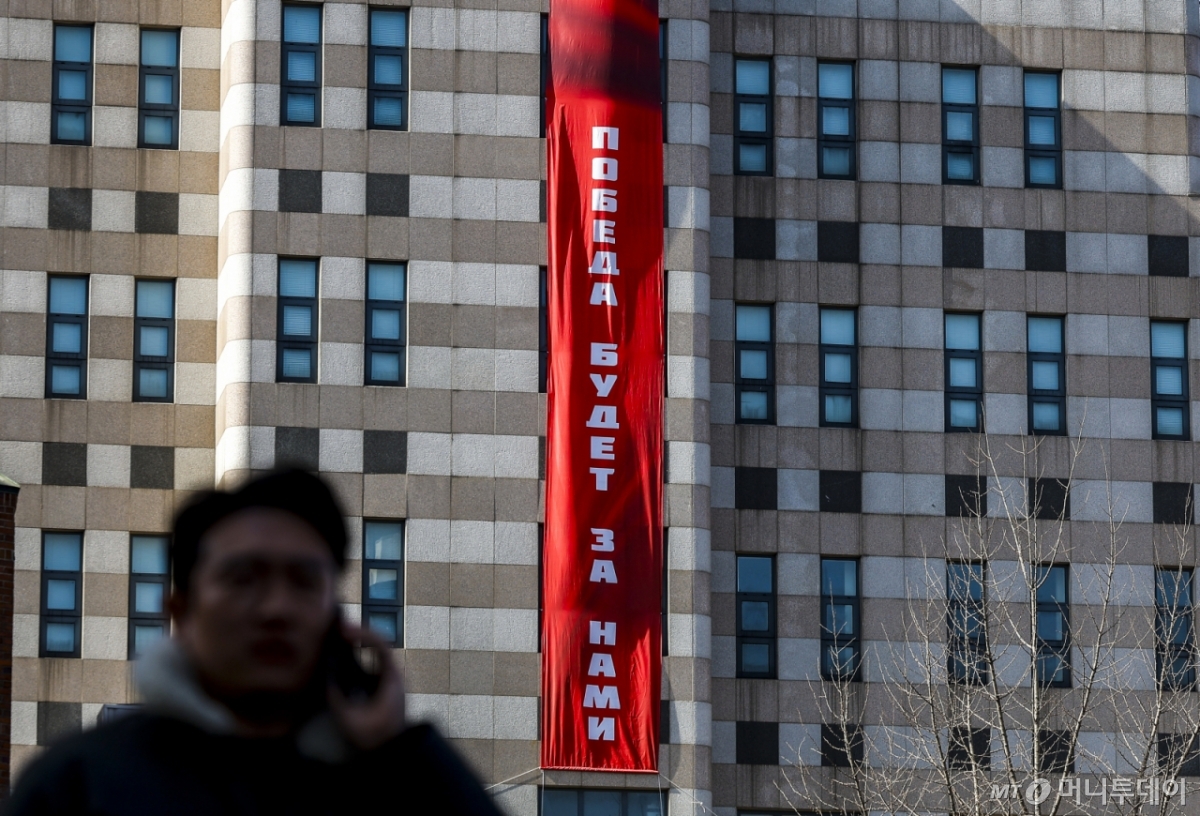 앞서 주한 러시아대사관은 서울 정동 대사관 외벽에 러시아어로 '승리는 우리의 것이다'(Победа будет за нами)라고 적힌 대형 현수막을 게시했다. 러시아-우크라이나 전쟁의 발발일인 2월22일 앞두고 게시한 만큼 전쟁을 연상시킨다는 이유로 논란이 일었다.