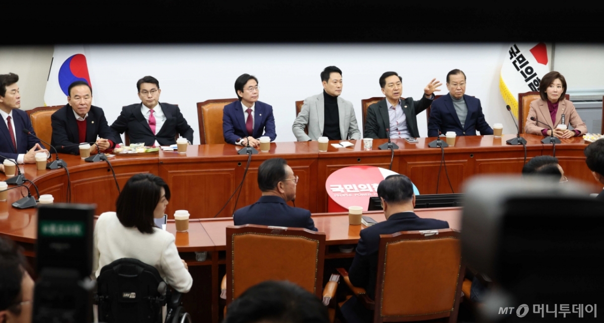 ![[서울=뉴시스] 조성봉 기자 = 장동혁 국민의힘 대표가 26일 오전 서울 여의도 국회에서 박덕흠, 윤상현, 조경태, 김기현, 권영세, 나경원 등 중진의원들과 당내 현안관련 비공개 회동을 하고 있다. 2026.02.26. suncho21@newsis.com /사진=조성봉](https://thumb.mt.co.kr/cdn-cgi/image/f=avif/21/2026/02/2026022715155023656_1.jpg)