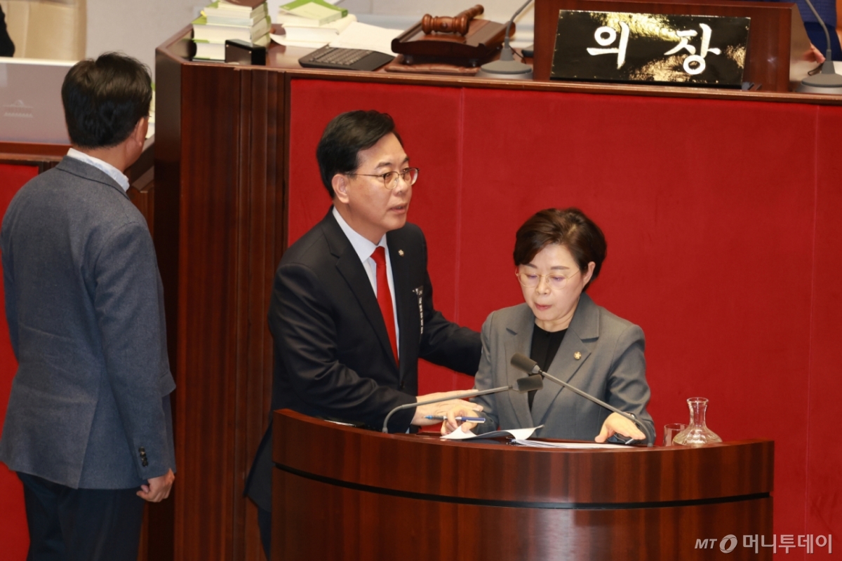![[서울=뉴시스] 고승민 기자 = 송언석 국민의힘 원내대표가 1일 서울 여의도 국회에서 열린 제432회 국회(임시회) 제8차 본회의에서 무제한토론 중인 김정재 의원에게 토론을 종결할 것을 알리고 있다. 2026.03.01. kkssmm99@newsis.com /사진=고승민](https://thumb.mt.co.kr/cdn-cgi/image/f=avif/21/2026/03/2026030115591436984_1.jpg)