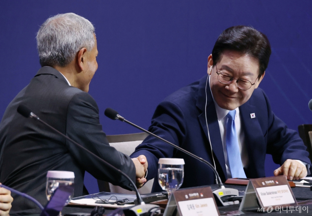 ![[싱가포르=뉴시스] 최동준 기자 = 싱가포르를 국빈 방문 중인 이재명 대통령이 2일(현지 시간) 한 호텔에서 열린 한-싱 AI 커넥트 서밋에서 비비안 발라크리쉬난 싱가포르 외교장관 발언 후 악수를 하고 있다. 2026.03.02. photocdj@newsis.com /사진=](https://thumb.mt.co.kr/cdn-cgi/image/f=avif/21/2026/03/2026030216441178683_1.jpg)