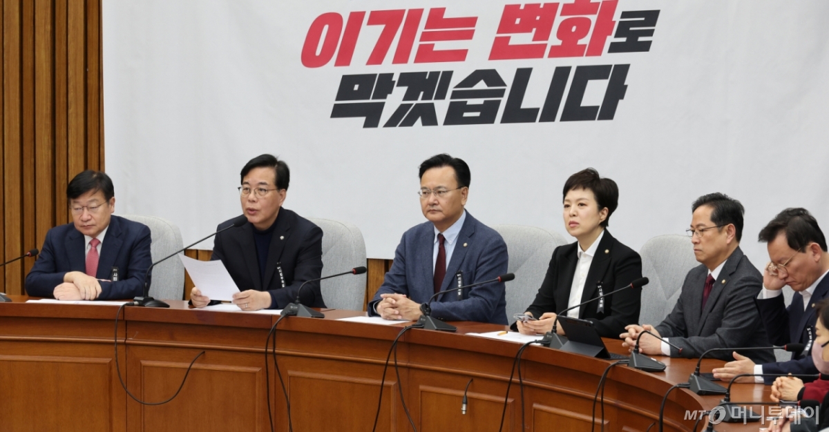 ![[서울=뉴시스] 김금보 기자 = 송언석 국민의힘 원내대표가 3일 오전 서울 여의도 국회에서 열린 원내대책회의에서 발언을 하고 있다. 2026.03.03. kgb@newsis.com /사진=김금보](https://thumb.mt.co.kr/cdn-cgi/image/f=avif/21/2026/03/2026030309391075552_1.jpg)